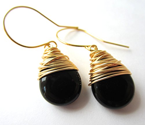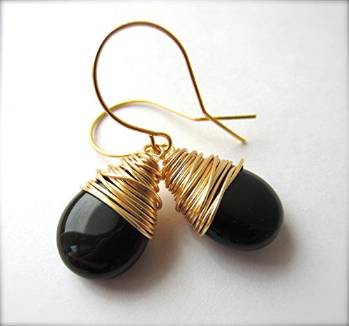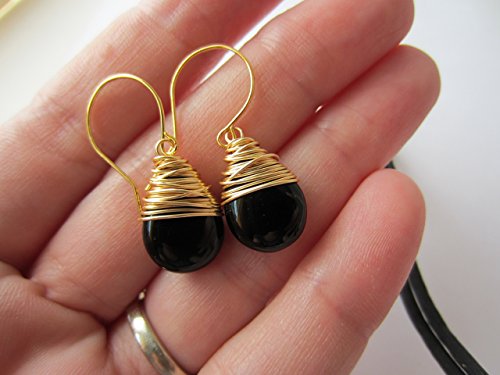 -. Title : Black Drop Earrings Wire Wrapped Czech Glass Drops Gold Tone