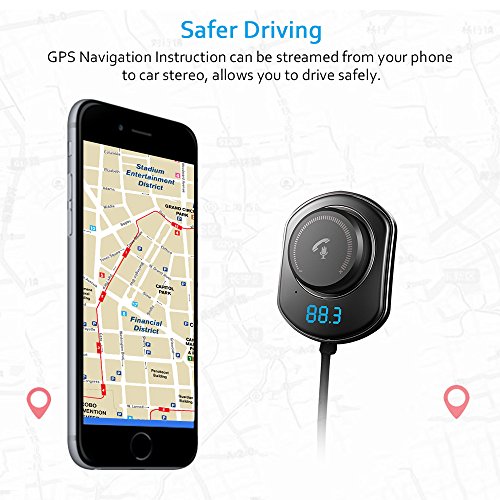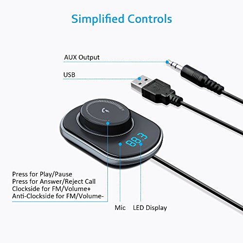 One Button Control: Supports AVRCP technology--Play/Pause, Previous/Next song, Volume up/down; Answer/Reject calls, and Siri activation; Digital Display helps to adjust FM transmission frequency easily (87.5-108 MHz).