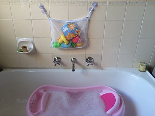 BATHROOM ACCESSORIES for TOY STORAGE: Our product has back up SUCTION CUPS, so if 1 cup loses SUCTION, there is another one to hold it up. Then you simply re-apply cups (able to hold up to 4.4 pounds). Works great on smooth flat tiles, glass and mirrors.