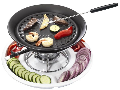 -. Feature : Nonstick, tabletop grill; comes with 4, color-coded, 9-inch roasting forks / Set includes: divided ceramic cooking tray, metal grill pedestal, grilling pan with nonstick surface, fuel holder, and 4 roasting forks / Holder houses a 7-ounce can of fuel; heat-resistant handle with built-in snuffer / Ceramic tray has grooved base for grill pedestal; 4 food compartments / Fuel sold separately; hand wash griller top and pan; dishwasher-safe forks and tray