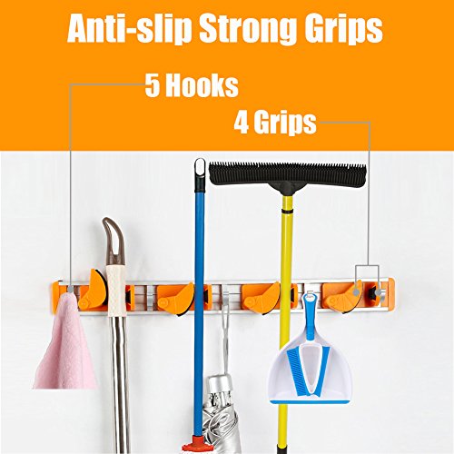 Mop and Broom Holder Wall Mounted Organizer with Towel Hooks, Home Storage Solutions for Kitchen, Closet, Garden, Garage and Shed Tools Organization (4 Position 5 Hooks, Orange)