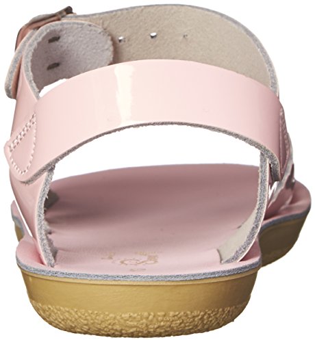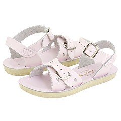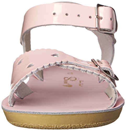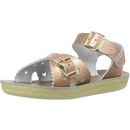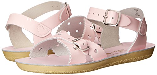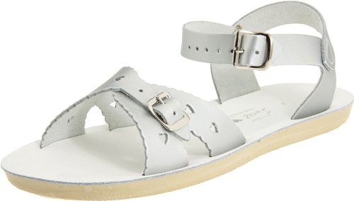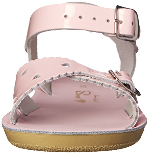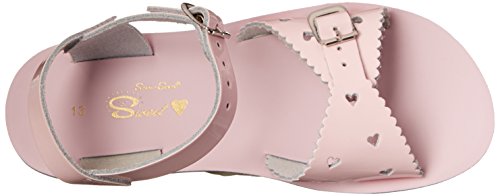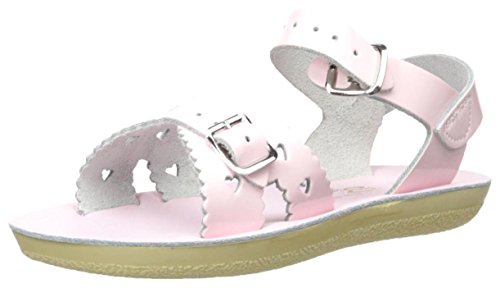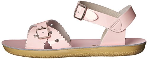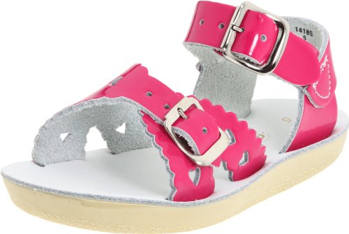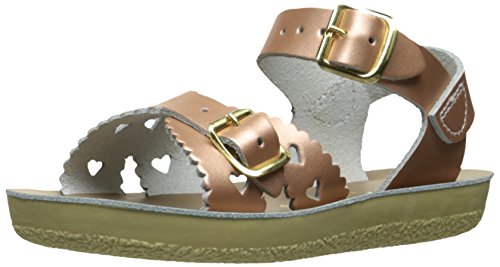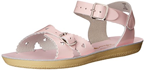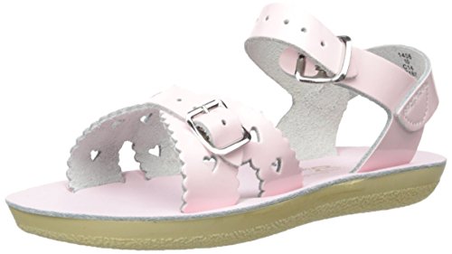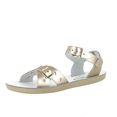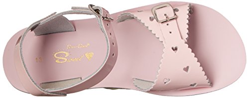 Water-friendly sandal with leather upper featuring scalloped edging and heart cutouts