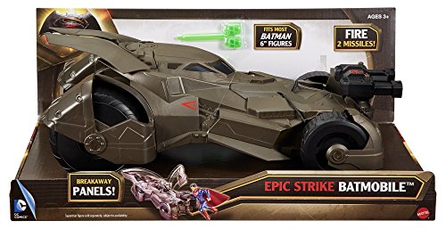 -. Binding : Toy -. Brand : Mattel -. EAN : 0887961220889 -. Feature : Celebrate the new Batman v Superman: Dawn Of Justice movie / Iconic detail from the film / Features breakaway panels / True to movie style / Fits 6" figures -. IsAdultProduct : 0 -. Label : Mattel -. Manufacturer : Mattel -. Model : DHY29 -. MPN : DHY29 -. PackageQuantity : 1 -. PartNumber : DHY29 -. ProductGroup : Toy -. ProductTypeName : TOYS_AND_GAMES -. Publisher : Mattel -. ReleaseDate : 2016-01-01 -. Studio : Mattel -. Title : Batman v Superman: Dawn of Justice Epic Strike Batmobile Vehicle -. UPC : 887961220889 -. Warranty : 1 year warranty against manufacturer defects