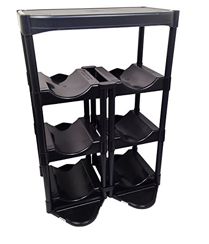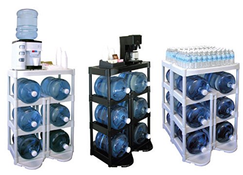 - Each bottle shelf is made of high density black plastic with an in-molded well which hold 5 gallon water bottles securely in place