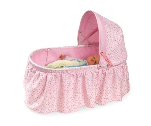 Badger Basket’s Folding Doll Cradle with Hood is roomy enough for the largest baby dolls with many nice features for your child. Pretty, pink, floral-print skirt cascades to the floor bursting with tiny rosebuds and a faux-eyelet pattern. Locking hinges keep the large, adjustable hood open. Release the hinges to fold the canopy flat. Small hands can easily rock the sturdy, metal frame side-to-side. Support bars inside the cradle can be unlatched so the cradle body folds flat to take the fun on the road. Your doll will appreciate the comfortable, padded mat inside the cradle, too! Makes an impressive display for doll collectors. For Dolls up to 22 inches. Fits 18 inch dolls such as American Girl, My Life As, Madame Alexander, and Our Generation; and also fits 15 inch American Girl Bitty Baby dolls and 14.5 inch American Girl WellieWishers dolls. Doll cradle is made with metal and plastic with an engineered wood bottom board. Bedding is made with 85% Polyester/15% Cotton fabric with 100% Polyester fill. Overall assembled dimensions of 24 inches L x 12.75 inches W x 22 inches H. The interior of the cradle is 23 inches L x 9.75 inches W x 6.5 inches H. All measurements approximate. Wipe clean, spot clean, and hand wash as needed. Adult assembly required. Illustrated instructions included. For children from three years old and up. This item is to be used with dolls only and is never to be used with real infants or pets. /! WARNING: CHOKING HAZARD - Small parts. Not for children under 3 yrs. Product complies with all currently applicable safety standards. Product includes a limited warranty of 30 Days Parts to the original purchaser. Doll and doll clothes/accessories not included. Product may vary slightly from shown and described. Props/accessories shown are for illustration purposes only and are not included with the product. Actual color/finish may vary slightly from screen display. This item ships in its original carton which may include a product photo.Feature