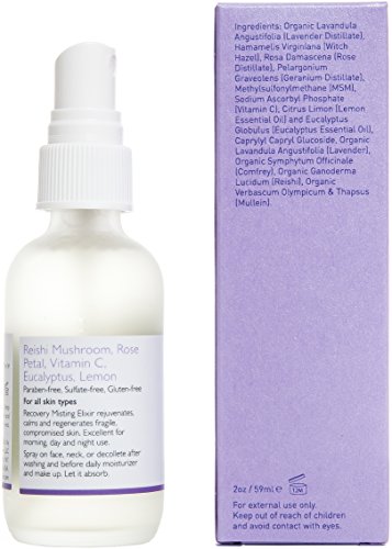 Recovery Misting Elixir calms fragile, compromised skin and helps reduce the appearance of fine lines and wrinkles with lavender, mullein, rose petals, geranium, comfrey, and reishi mushroom. Healing antioxidants also help to neutralize damaging free radicals. This formula is excellent for both morning and evening use, and even mid-day.