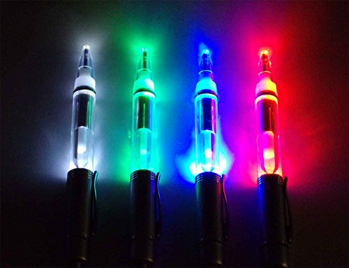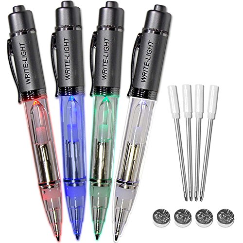 -. Feature : 4 PACK (GLOWING LED) PEN LIGHT WRITING PENS: Perfect for writing in low light conditions. Fine tip pen with Black ink. / COLORFUL GLOWING LIGHT: Red, Blue, Green, and White. Light is diffused through the clear acrylic body creating a beautiful glow. / USEFUL AND PRACTICAL: Great to have when you need a source of light or to write in the dark. Place in your purse, shirt pocket, or bedside drawer for easy access. Handy in case of emergencies. Can also be used as glow sticks for outdoor events. / FREE EXTRAS: Every 4 Pack comes with four free replacement ink cartridges, and four free replacement batteries!! / 100% MONEY-BACK GUARANTEE - Write-LightTM pens are backed by our 30 Day 100% Satisfaction Guarantee.