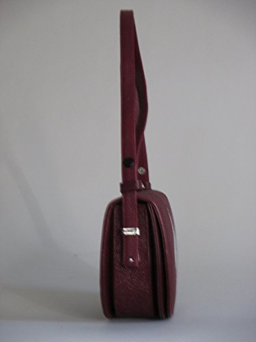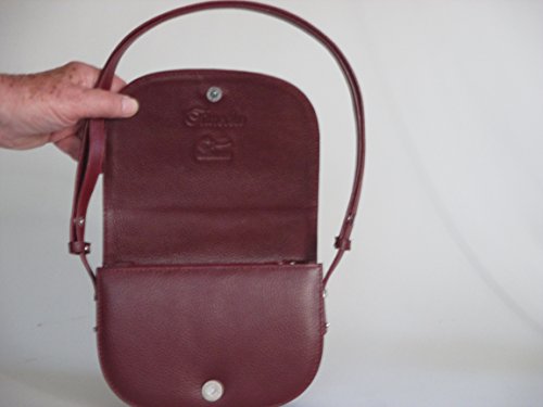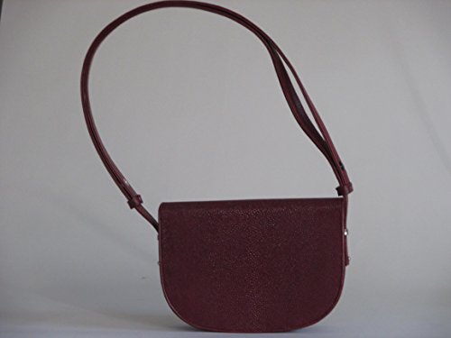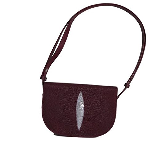 - Women's rounded front flap stingray skin handbag with convertible shoulder strap, burgundy. 8 inches wide, 6 inches high, 3 inches deep at bottom. Model 10112.