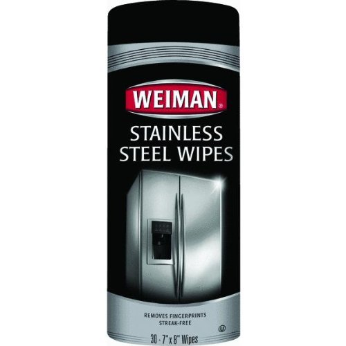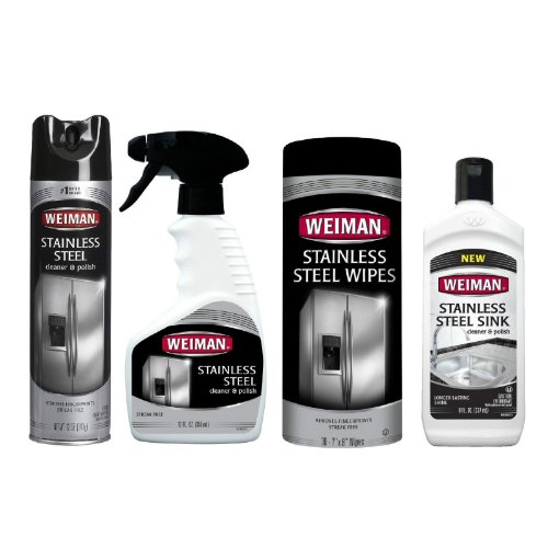 -. Feature : Weiman Stainless Steel Cleaning Kit includes everything needed to keep your stainless steel clean and polished. / Easily removes fingerP.R.Ints, smudges, grease and grime and leaves a brilliant, streak-free shine! / Provides a protective coating which repels dust & dirt / The set includes: 12oz Aerosol, 12oz Spray, 30ct Canister of Wipes and an 8oz Bottle of Stainless Steel Sink Cleaner & Polish / Made in the USA