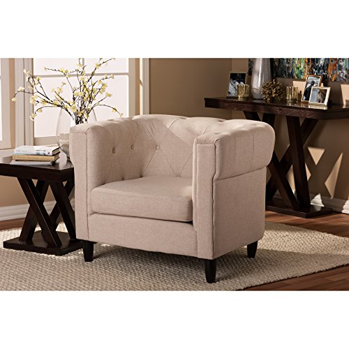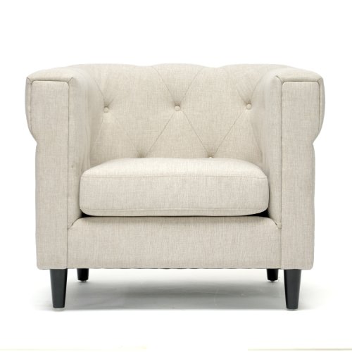 Studio : Wholesale Interiors Publisher : Wholesale Interiors Binding : Kitchen Product Description This handsome update to the classic chesterfield style is a casual, urban, and modern living room furniture collection. Our Cortland Modern Chesterfield Chair is made with a birch wood frame, CA117 flame retardant foam cushions, and beige linen blend upholstery. A removable seat cushion and black wood legs finish off the look. This designer chesterfield chair is Chinese-made, requires assembly, and should be spot cleaned. A matching sofa is also available (sold separately). Product Dimension: 36"W x 29.75"D x 29.25"H Seat Dimension: 23"W x 22.5"D x 18.75"H. 0