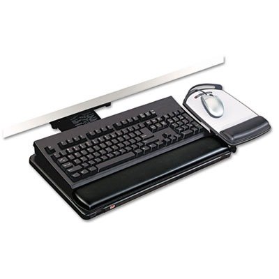 -. Feature : Highly adjustable keyboard platform features lateral adjustment, 6" height range, 360 swivel and +10/-15 tilt. / Lever handle ensures positive lock on platform height; just flip lever to the right, adjust height and move lever back to lock in place. / Separate pull lever for tilt adjustment. / Independent articulating mouse platform can be mounted right or left. / Patented leatherette gel wrist rests with antimicrobial product protection.