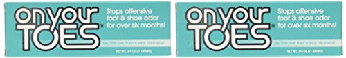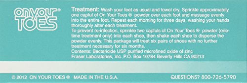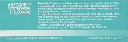 -. Binding : Health and Beauty -. Brand : Fraser Laboratories -. Feature : Eliminates Foot Odor for at least Six Months! / Podiatrist Recommended Foot Powder / Aluminum Free - Made in the USA / Money Back Guarentee from Manufacturer / One tube will treat up to three pairs of shoes for six months -. Label : Fraser Laboratories -. Manufacturer : Fraser Laboratories -. ProductGroup : Health and Beauty -. ProductTypeName : HEALTH_PERSONAL_CARE -. Publisher : Fraser Laboratories -. Studio : Fraser Laboratories -. Title : On Your Toes Foot Bactericide Powder - Eliminates Foot Odor for Six Months Why bother with messy daily use of creams when one safe, simple treatment of On Your Toes will eliminate odor for OVER six months or your money back! On Your Toes' unique "Microfined" bactericide formula is absorbed into the pores of the footwear preventing further bacterial growth for at least SIX MONTHS! On Your Toes treats SIX pairs of shoes or THREE pairs of sneakers---powerful enough to handle even the smelliest of sports shoes! No more embarrassment in the locker room! (or the bedroom!). Aluminum Free - Made in the USA Contents: Bactericide, USP purified microfined oxides of zinc.