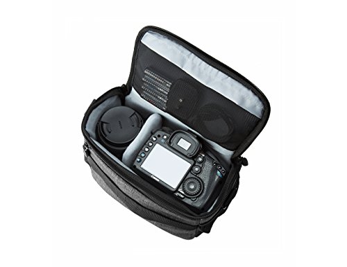 Three main compartments and 6 mesh pockets for one DSLR camera, 1-2 lenses, flash, phone, chargers, memory cards and other camera accessories. Inside the 2 padded dividers with velcro makes it easy to put and fix your portable accessories and protects your equipments from bumps & shock.