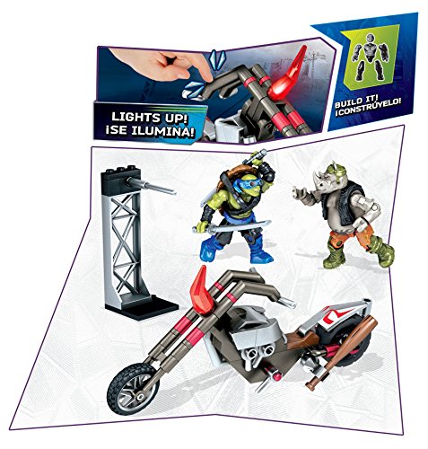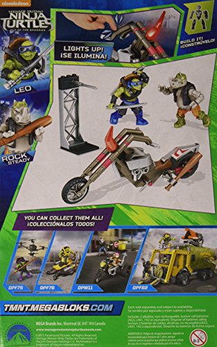 -. Binding : Toy -. Brand : Mega Bloks -. EAN : 0887961315899 -. Feature : The chase is on! / Buildable motorcycle with rolling wheels and shock sensor-activated LED lights, and buildable parking pillar with swivel action / Two buildable, fully articulated micro action figures / Includes Raphael with twin sai accessories and Rocksteady with baseball bat accessory / Connect with other Mega Bloks Teenage Mutant Ninja Turtles: Out of the Shadows sets and build your own movie-themed brawls -. IsAdultProduct : 0 -. ItemPartNumber : DPF79 -. Label : Mattel -. Manufacturer : Mattel -. Model : DPF79 -. MPN : DPF79 -. PackageQuantity : 1 -. PartNumber : DPF79 -. ProductGroup : Toy -. ProductTypeName : TOYS_AND_GAMES -. Publisher : Mattel -. ReleaseDate : 2016-04-10 -. Studio : Mattel -. Title : Mega Bloks Teenange Mutant Ninja Turtles: Out of The Shadows Rocksteady Moto Attack Playset -. UPC : 887961315899 -. Warranty : 1 year warranty against manufacturer defects