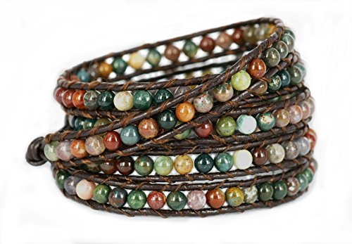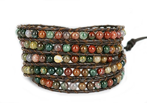 "X Hot" Mix Color India Agate Beads Bracelet. Retro & Fashion wrap bracelet, rounded on your wrist, Metal oval plated Snap Button Lock Adjustable, Handcrafted of Genuine leather. Handmade bracelet wraps nearly every wrist for 5 around. Easy for dressing match, such as jeans, dresses exotic style and anything you'll wear. Placed in a beautiful gift box with well package. The most important thing is, enjoy your purchase!......Tips:Feel too long or short? Try to untie the extension part of the leather knot for adjustment to creat a new knot to fit your wrist. Also can be cut off the spare leather parts if you like.Feature