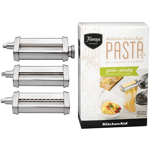 -. Binding : Product Bundle -. Brand : KitchenAid -. Feature : Commercial-style stainless steel pasta rollers and cutters for smooth rolling and clean cutting of pasta dough / Powered by the mixer to make quick and easy work of fresh homemade pasta in your kitchen / Fast and Easy - Ready in 11 minutes / KitchenAid Stand Mixer and KitchenAid Pasta Roller & Cutter attachment compatible -. ProductGroup : Kitchen -. ProductTypeName : KITCHEN -. Title : KitchenAid KSMPRA 3-Piece Pasta Roller and Cutter with KitchenAid Franzese Garlic and Parsley Pasta Mix