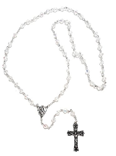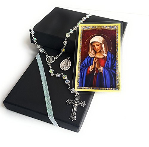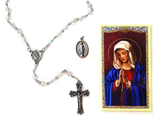 Crystal Clear Christian Rosary Gift set (Miraculous medal and holy card with prayer) (Clear)