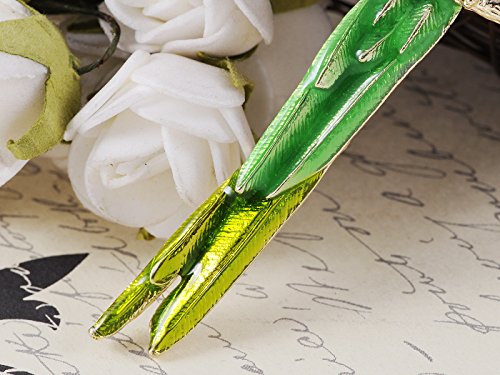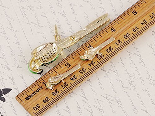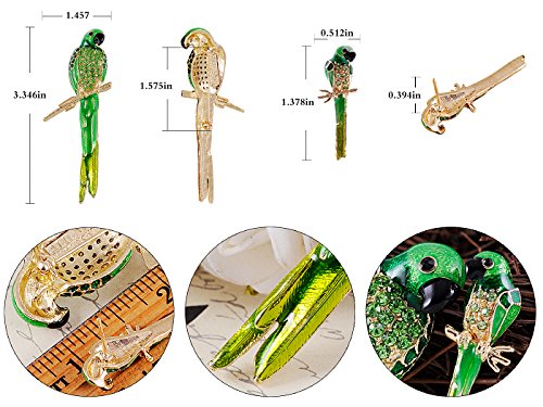 UNIQUE DESIGN: Set of parrot earrings and brooch with peridot colored rhinestones and light and dark green glossy painted enamel.