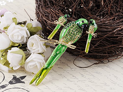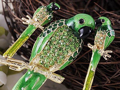 Any bird lover will appreciate this cute set of stud earrings and brooch. The earrings and brooch are adorned with peridot colored rhinestones and coated with glossy enamel. This parrot family looks friendly perched up on tree branches.