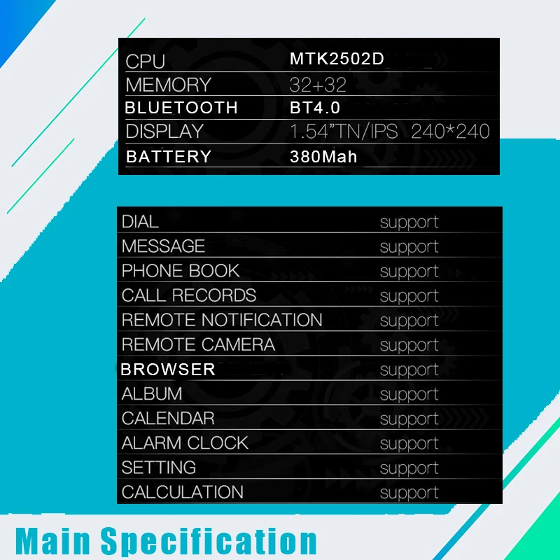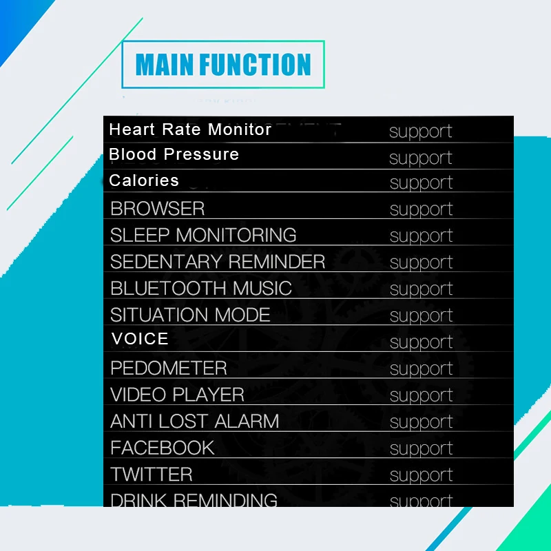 Function:Dial Call,Message Reminder,Answer Call,Passometer,Alarm Clock,Fitness Tracker,Call Reminder,Calculators,Calendar,Remote Control,Sleep Tracker,Heart Rate Tracker,Push Message