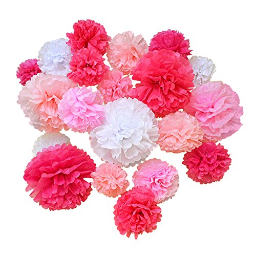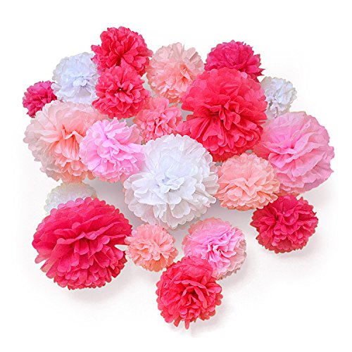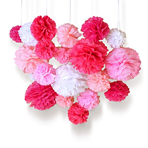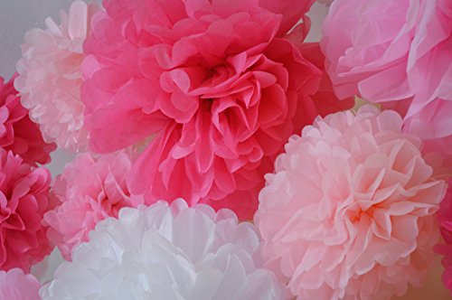 - 20 PIECE 5 COLOR ASSORTED TISSUE PAPER POM POM SET - Five colors include Light Pink, Rose Pink, Fuchsia Pink, Magenta Pink and White. All 5 colors come in the following sizes: 8 inch, 14 inch and two 10 inch pom poms.