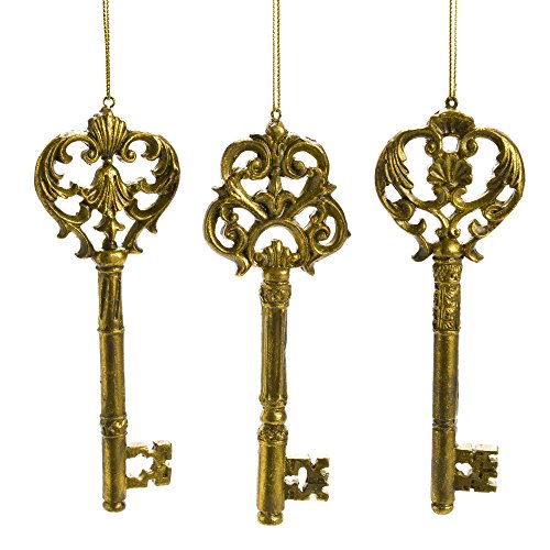 -. Feature : Hanging tree ornament set / SIZE: 2.25" x 6.25" / Made of Resin, Great Quality! / Bubble wrapped to protect finish / Features three gold colored antique style skeleton key ornaments.