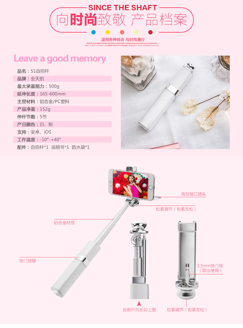 随身隐形口红香水美颜自拍杆手机通用自拍神器