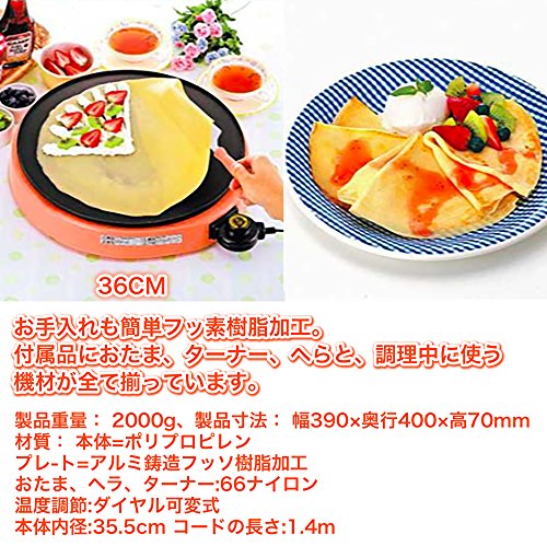 ◆수작업 크레페용 핫 플레이트◆크레페뿐만 아니라,핫 케익이나 야채부침 등도 탐(그을림) 간편하게 집에서 티 타임이 즐길 수 있습니다.◆손질도 간단 불소 수지 가공◆와이드 플레이트36cm / ■ 사양 ■본체크기(약):폭39.0×(길이)깊이40.0×높이7.0cm 본체 안쪽 치수:약35.5cm 중량:약2.0kg 소비전력:1200W 온도 조절 범위:다이얼 가변식 코드장:약1.4m 부속품:국자고, 헤라,터너 /