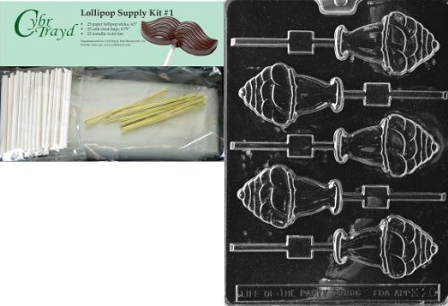 CYBRTRAYD 45STK25G-K026 ICE CREAM SUNDAE LOLLY KIDS CHOCOLATE CANDY MOLD WITH LOLLIPOP SUPPLY BUNDLE, INCLUDES 25 LOLLIPOP STICKS, 25 CELLO BAGS, 25 GOLD TWIST TIES AND INSTRUCTIONS