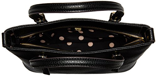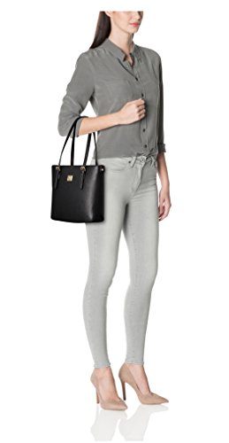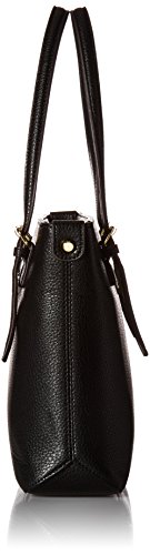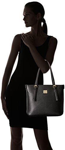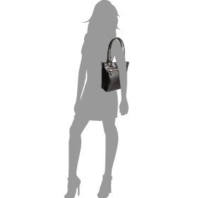 The Small Shopper tote handbag by Anne Klein has a pebbled vinyl exterior, silvertone hardware, double handles, inside and outside zip pockets, zip closure, and the Anne Klein signature lion's head emblem on the front. Measures approximately 12'' x 10''. Vinyl.