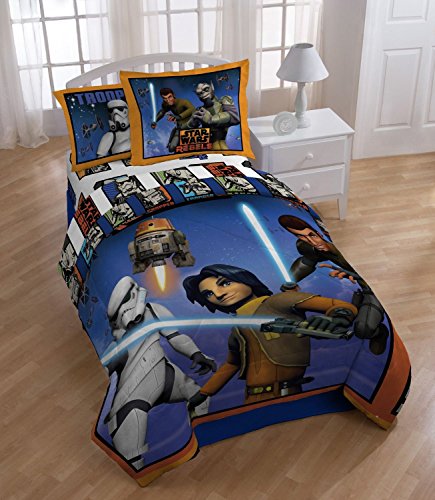 Star Wars Rebels Comforter Set Includes Comforter pillow Sham and bedskirt Star Wars fans will love to cuddle up at night with this fun set Set is for a twin size bed Based on the show which is set 4 years before Episode IV and tells the story of the Rebellions begininngs Featuring beloved characters: Ezra, Kanan, and Chopper the Droid.Feature