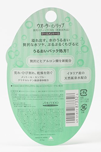 -. Binding : Health and Beauty -. Brand : Water In Lip -. EAN : 4901872873326 -. Feature : | IMPORTANT NOTICE | Made for Japan market and in a Japanese retail package. Manual(s) is in Japanese only. -. IsAdultProduct : 0 -. Label : shiseido -. Manufacturer : shiseido -. MPN : Lip38973 -. PackageQuantity : 1 -. PartNumber : Lip38973 -. ProductGroup : Health and Beauty -. ProductTypeName : HEALTH_PERSONAL_CARE -. Publisher : shiseido -. Studio : shiseido -. Title : shiseido Water In Lip Cool Menthol 3g -. UPC : 887996939725
