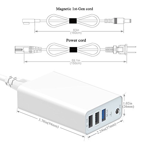 AC Input: 100 - 240V / Total Output: 19V 4.5A, 90W / Laptop output: 14.85V 3.05A, 16.5V 3.65A / Total 3 USB Output: 5V 4.5A / Power Cord: 4.92ft, DC Cord: 5.25ft / Connector: Magnetic 1st-Gen L-Shaped ( Search for Magnetic 2nd-Gen, Asin: B01MCWMGKL)
