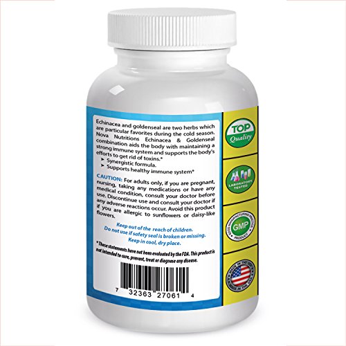 -. Binding : Health and Beauty -. Brand : Nova Nutritions -. EAN : 0732363270614 -. Feature : Supports Healthy Immune Function* / Echinacea promotes well-being during cold weather season* / This combination of herbs were used extensively for centuries by Native Americans for overall health. / Promotes Healthy Respiratory Response* / Top Quality - Laboratory Tested -. IsAdultProduct : 0 -. Label : Nova Nutritions -. LegalDisclaimer : *These statements have not been evaluated by the FDA. These products are not intended to diagnose, treat, cure, or prevent any disease. -. Manufacturer : Nova Nutritions -. MPN : N5DZAJ0 -. PackageQuantity : 1 -. PartNumber : N5DZAJ0 -. ProductGroup : Health and Beauty -. ProductTypeName : HEALTH_PERSONAL_CARE -. Publisher : Nova Nutritions -. Studio : Nova Nutritions -. Title : Nova Nutritions Echinacea Goldenseal Complex 450 mg 250 Capsules - promotes well-being during cold weather season -. UPC : 732363270614