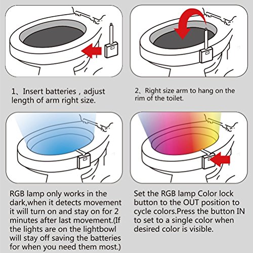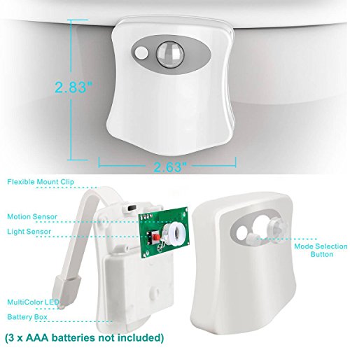 - Motion and Light Sensing - Superior motion detection technology detects movements within 5 feet and turns on the light, automatically turns off after 64 seconds if no motion detected prolonging battery life. Decoration the dark bathroom and lighting your way, protecting kids from bumped in the dark.Dual Sensors working together, LED light will only turns on when they detects motion and low level ambient light. Otherwise, toilet light keeps off to maximize battery life time.