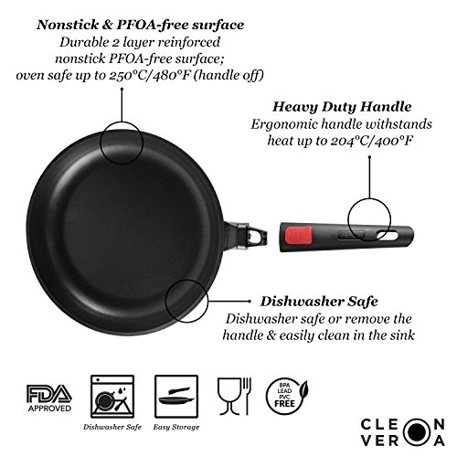 ✔ PRO QUALITY - Cleverona Essential 11" fry pan has a flared rim for drip-free pouring, a thick 4.5 mm warp-resistant bottom that evenly distributes heat from all heat sources (induction, radiant, ceramic, halogen & gas). Withstands heat up to 204°C/400°F (handle on)