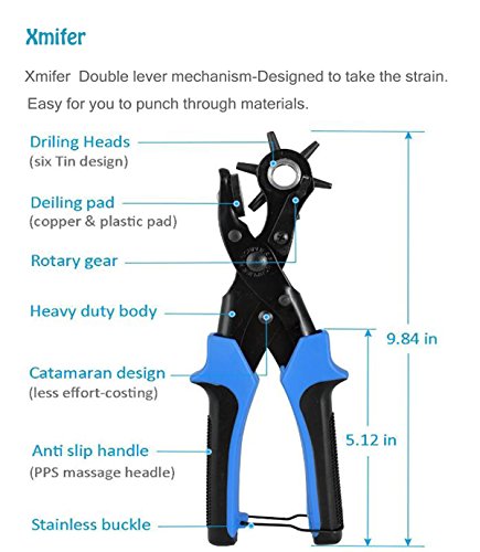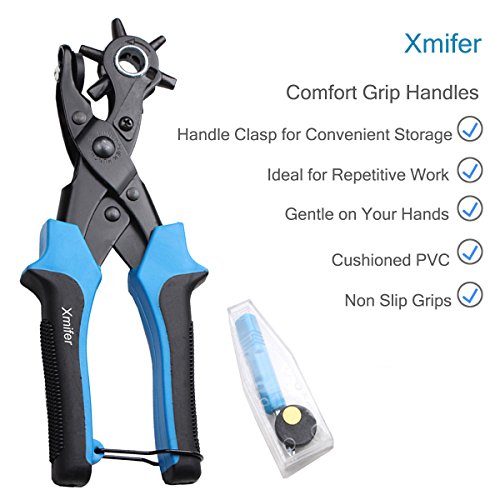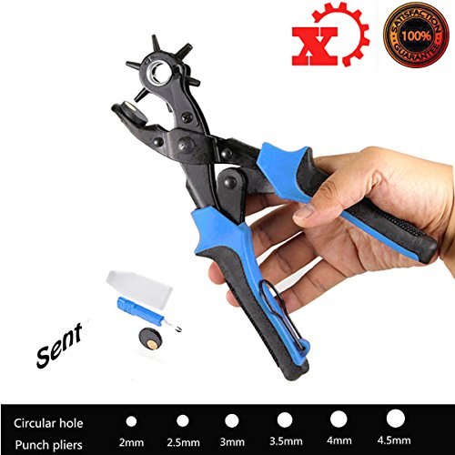 - 【PUNCHES THE HOLES CLEANLY AND EASILY】- Effortlessly Creates perfectly punched holes without fraying edges. This Leather Punch Pliers has a heavy duty metal body with adjustable wheel. With a turn of the wheel, you can punch six different size holes quickly and easily. This rotary punch has the six most commonly used hole sizes for leather craft projects.