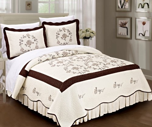 Serenta Classic Rose Flowers 100% Cotton Bedspread Quilt Blanket 3 Piece Bed Set, Queen, Chocolate