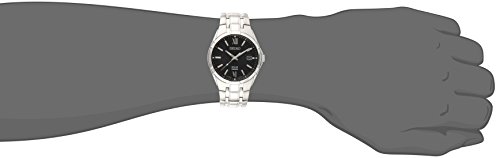 Stainless steel case and bracelet. Fixed stainless steel bezel. Black dial with silver-tone hands and index hour markers. Roman numerals mark the 6 and 12 o'clock positions. Minute markers around the outer rim. Dial Type: Analog. Luminescent hands and markers. Day of the week and date display at the 3 position. Solar quartz movement. Scratch resistant Hardlex crystal. Solid case back. Case diameter: 43 mm. Round case shape. Water resistant at 100 meters / 330 feet. Functions: date, hour, minute, second. Casual watch style. Seiko Solar Black Dial Mens Watch SNE215.Feature