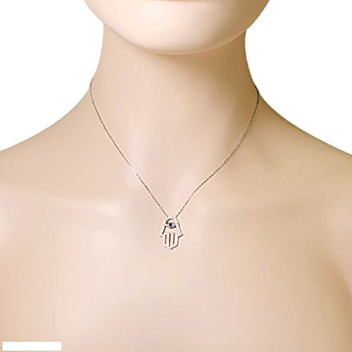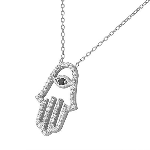 -. Binding : Jewelry -. Brand : Anguss Fashion Jewelry -. Department : girls -. Feature : Length (inches):18 / The pendant showcases an elegant design of the Hamsa charm set onto a delicate link chain and sparkling with a single gorgeous black rhinestone and multiple small white CZ stones that decorate this unique pendant. The Hamsa charm on this necklace is believed to protect the wearer from bad luck. The necklace is crafted of rhodium plated. -. Label : Anguss -. Manufacturer : Anguss -. Model : 271225746123 -. MPN : 271225746123 -. PartNumber : 271225746123 -. ProductGroup : Jewelry -. ProductTypeName : FASHIONNECKLACEBRACELETANKLET -. Publisher : Anguss -. Studio : Anguss -. Title : Evil Eye Hamsa White Crystals CZ Womens Pendant Necklace