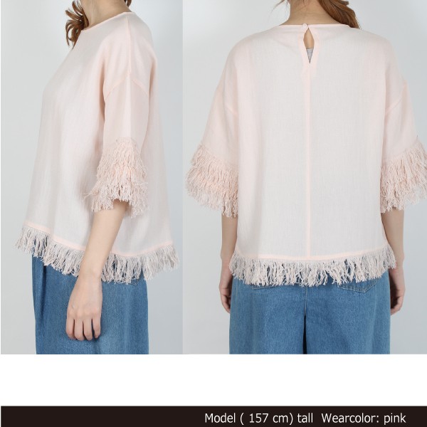 | 実寸 | 着丈:54cm(SNP~)、肩幅:56cm、バスト:108cm、袖丈:20cm+フリンジ、袖口:36cm、裾周り:110cm |