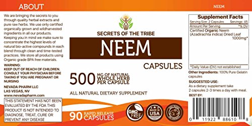 -. Feature : Organic Neem (Azadirachta indica) Dried Leaf / Capsules, 500 mg, Supplement / All Natural Herbal Supplements, GMO FREE, MADE IN USA