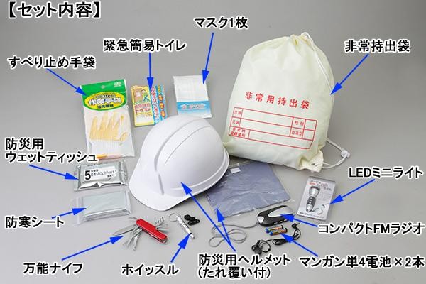| セット内容 | 防災用ヘルメット(たれ覆い付)、防寒シート、LEDミニライト(ボタン電池LR41×4個入※テスト電池)、ホイッスル、防災用ウェットティッシュ20枚、すべり止め手袋、緊急簡易トイレ(1回分)、マスク1枚、万能ナイフ、コンパクトFMラジオ(マンガン単4電池×2本付※テスト電池)、非常持出袋 |