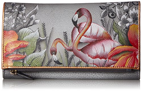 -. Title : Anuschka Anuschka Handpainted Leather Three Fold Clutch-flamboyant Flmingos Wallet