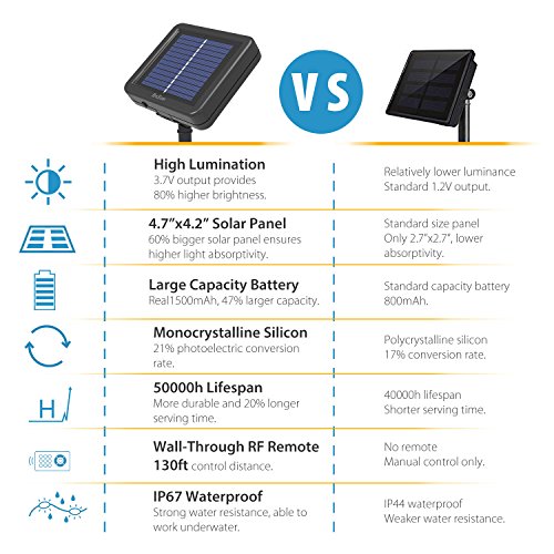 - Exclusive RF Remote: Specially designed for outdoors, updated RF signal works through walls. Amazed 130ft remote range allows you customize illumination conveniently.