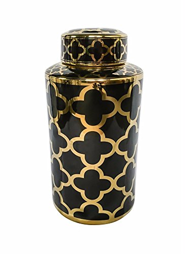 Benzara Classic Decorative Ceramic Covered Jar with Lid, Black and Gold
