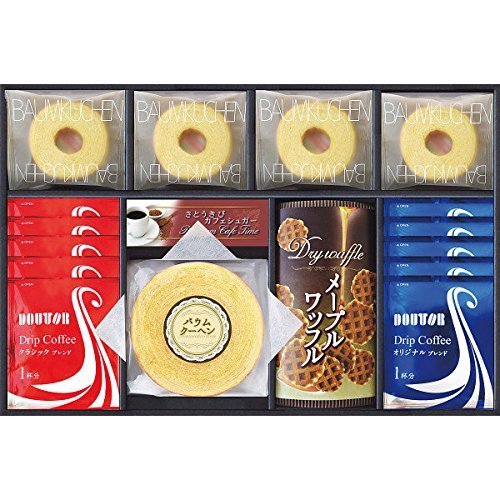 原材料:ドトールドリップコーヒー(クラシックブレンド)7 g×5、ドトールドリップコーヒー(オリジナルブレンド)7 g×5、バウムクーヘン約12.5 cm径×1、ドライワッフル(メープル4枚入)×1、ミニバウムクーヘン×4、さとうきびカフェシュガー×5