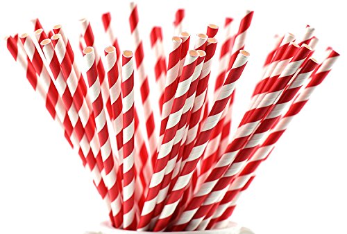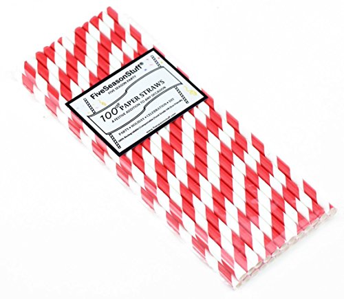 FiveSeasonStuff 100 Pack 100% Biodegradable Paper Drinking Straws for Weddings, Birthdays, Showers, Christenings, Engagements, Graduation, New Years (White | Red Stripes)