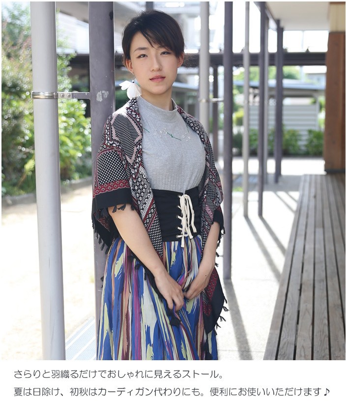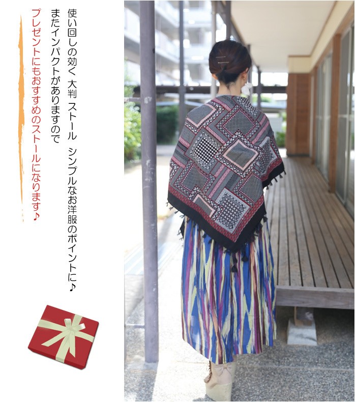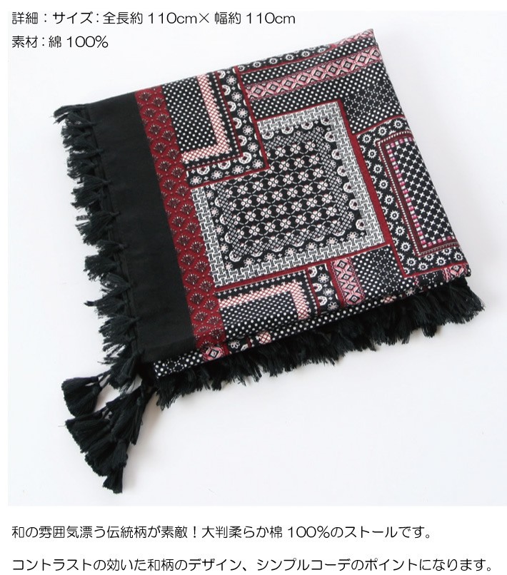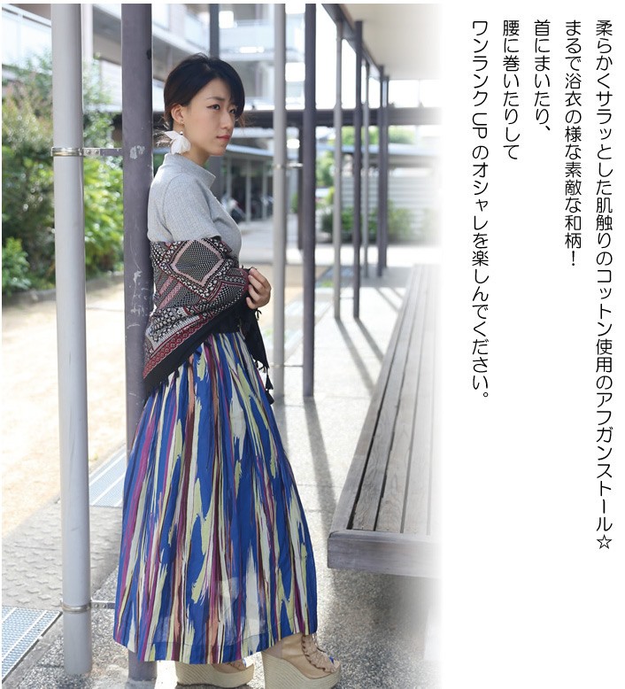 ★さらりと羽織るだけでおしゃれに見えるストール。夏は日除け、初秋はカーディガン代わりにも。便利にお使いいただけます♪ ★柔らかくサラッとした肌触りのコットン使用のアフガンストール☆まるで浴衣の様な素敵な和柄!首にまいたり、腰に巻いたりしてワンランクUPのオシャレを楽しんでください。 ★使い回しの効く 大判 ストール シンプルなお洋服のポイントに♪またインパクトがありますのでプレゼントにもおすすめのストールになります♪ ★和の雰囲気漂う伝統柄が素敵!大判柔らか棉100%のストールです。 コントラストの効いた和柄のデザイン、シンプルコーデのポイントになります |