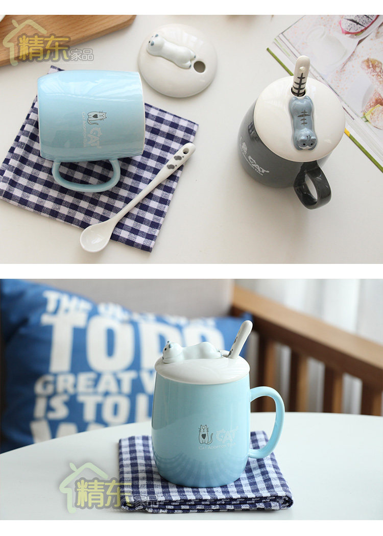 文艺小清新猫咪可爱陶瓷水杯子简约创意带盖勺马克杯办公室咖啡杯